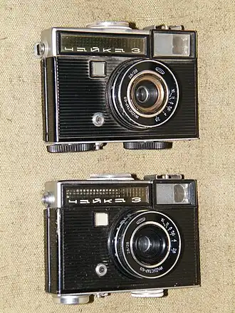 - Фотоаппарат «Чайка-3» имел встроенный несопряжённый экспонометр. Определение экспозиции производится с помощью двухстрелочного индикатора, причём в крайних положениях стрелок (све́та много или све́та мало) при попытке совместить обе стрелки происходит изменение значения установленной светочувствительности фотоплёнки; экспонометр «подсказывает», фотоплёнку какой светочувствительности (большей или меньшей) желательно применить. Головка установки выдержек совмещена с соответствующим диском калькулятора экспонометра, фотографу только остаётся установить значение диафрагмы на объективе.
