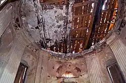 Внутреннее пространство основного объема представляет собой круглый зал, перекрытый закрытым куполом, не сохранившимся до нашего времени. Стены усеяны рифлеными пилястрами и отделаны профилированными карнизами с сандриками . Входной объем перекрыт крестообразным сводом, а алтарная часть перекрыта цилиндрическим сводом . Последний открыт в основной объем арочным сводом, как и хоры, расположенные на втором этаже притвора.