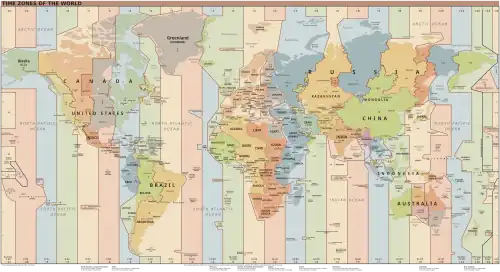 В основу современной системы часовых поясов положено всемирное координированное время, от которого зависит время всех поясов. Чтобы не вводить местное солнечное время для каждого значения долготы, поверхность Земли условно поделена на 24 часовых пояса, местное время на границах которых изменяется ровно на 1 час. Географические часовые пояса ограничиваются меридианами, проходящими на 7,5° восточнее и западнее среднего меридиана каждого пояса, причём в зоне гринвичского меридиана действует всемирное время. Однако в реальности, для сохранения единого времени в пределах одной административной территории или группы территорий, границы поясов не совпадают с теоретическими граничными меридианами.