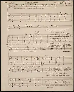 В 1847 году русский офицер, музыкант и композитор Клингер Иван Андреевич во время Кавказской войны попал в плен к чеченцам в ауле Оспан-Юрт, выучил чеченский язык и сделал первые нотные записи чеченских песен. Клингер был освобождён через два года при обмене русских пленных на чеченцев. Позже он издал книгу «Быт и нравы чеченцев», в которой были опубликованы его записи. Также известны песни записанные Львом Толстым со слов носителей. Эти песни были переведены на русский язык поэтом Афанасием Фетом. Несколько произведений были найдены сотрудниками ЦНТ в «Азиатском музыкальном журнале» который издавался в городе Астрахани в 1860—1870 годах[4].