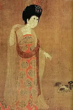 - Придворные дамы с цветами в причёсках. Ляонин, Музей провинции. Свиток. Это старейший и самый прекрасный свиток их всех, которые приписываются Чжоу Фану. Стоят печати эры Шао Син (1131-63) и владельцев из более поздних времён.