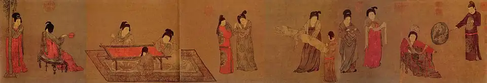 Свиток «Придворные дамы, играющие в нарды» имеет небольшие размеры (30х69см) и представляет собой южносунскую (XII — нач. XIII века) копию с оригинала VIII века. На нём изображены две немолодые наложницы, играющие в нарды (эта игра пришла в Китай из западной Индии, известно, что первым её любителем был знаменитый вэйский поэт Цао Чжи (192-232гг). На свитке изображена обыденная сценка в гареме, и несмотря на то, что речь идёт об игре, в картине не ощущается настроение азарта. Одна молодая наложница, облокотившись на служанку, следит за игрой, другая стоит в стороне рядом с евнухом, издали наблюдая за происходящим. Две служанки слева тащат тяжёлый кувшин. Композиция свитка состоит из трёх людских групп, расположенных симметрично.