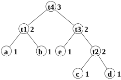 Каждый из пяти листьев имеет метки "1" (согласно 1-му правилу). Согласно правилу 3, п. "б" узлы t1 и t2 получают метки, равные 2. Теперь узел t3 имеет дочерние узлы с разными метками, так что для него метка будет также 2 (по правилу 3, п. "а"). Узел t4 опять имеет дочерние узлы с равными метками, так что метка для него будет равна 3 (правило 3, п. "б").