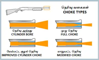 - Полный чок — сужение до 1. Кучность боя средними и мелкими номерами дроби достигает 60-70 %. Показатели боя крупной дробью и картечью неустойчивы, при стрельбе ими уменьшается постоянство боя от выстрела к выстрелу и ухудшается характер осыпи (увеличиваются «окна» между дробинами). Возможна стрельба специальными пулями и круглой пулей с соблюдением всех указанных выше предосторожностей.