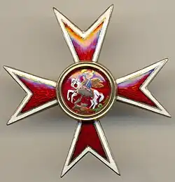 Нагрудный знак Высочайше утверждён 4 октября 1913 года. Мальтийский крест красной эмали с белым ободком. В середине его красный эмалевый кружок с золотым ободком, а на нём белая фигура Святого Георгия Победоносца.