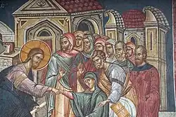 Мф. 9:20-22; Мк. 5:25-29; Лк. 8:43-48 | Чудо было совершено Христом по дороге в дом Иаира. Женщина, двенадцать лет страдавшая кровотечением, верившая, что ей достаточно коснуться одежд Христа, чтобы выздороветь, подошла к нему и дотронулась до края его одежды. «И тотчас иссяк у ней источник крови, и она ощутила в теле, что исцелена от болезни». Иисус почувствовал, что в этот момент «вышла из Него сила», спросил, кто коснулся его. Женщина «пала пред Ним и сказала Ему всю истину». Иисус же обратился к ней со словами: «вера твоя спасла тебя». |