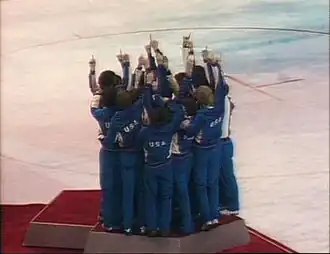 ![]() Сборная США ликует по поводу победы 4:3 над сборной СССР. | ||||||||||||||||