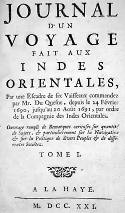 - Journal d’un voyage fait aux Indes Orientales par une escadre de six vaisseaux commandez par M. Du Quesne, depuis le 24 février 1690, jusqu’au 20 août 1691 (3 т., 1721),