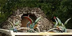Расположен на естественном склоне[1]. Состоит из двух закрытых туфовыми откосами уступчатых кирпичных стен, связанными балками, по которым сделаны четыре настила водопадных скатов. Сверху и снизу устроены одноарочные гроты, рядом с верхним гротом расположены три бронзовых дракона. По бокам каскада сделаны лестницы, за ними на пьедесталах стоят десять мраморных статуй[2].