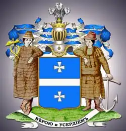 В щите имеющем голубое поле изображены два серебряных креста, один вверху, а другой внизу, а между ними в середине щита находится серебряная полоса.