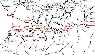 Н. И. Гродеков. 1883. Так как Меймене, во время войны с Афганистаном, помогали ханства Сарыпуль и Шибирхан, то и они были покорены и присоединены и владениям Шир-Али-хана. Самое покорение этих ханств совершено было раньше покорения Меймене, потому что они лежали на пути к столице ханства. Последний хан Шибирхана был Хаким-хан; он умер в плену в Кабуле.
