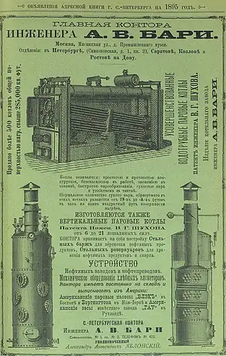 | Место работы | Санкт-Петербургские мастерские службы подвижного состава и тяги Петербурго-Варшавской железной дороги, Контора инженера А.В. Бари |