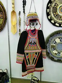 Головным убором был плотно облегающий голову ка-нор, расшитый бисером. Зимой поверх него носили большую меховую шапку. Женщины иногда надевали платок.