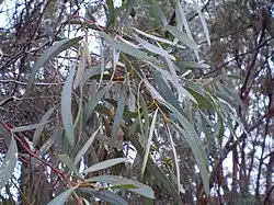 Euc. amygdalma растёт почти исключительно в Австралии; свежие листья его дают до 3 % масла уд. в. 0,850—0,886 с α D = —25° до —70°. Содержа цинеол, масло из Е. а. главным образом состоит из фелландрена.