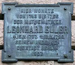 29 мая 1741 года разрешение Академии было получено[35]. Эйлер был «отпущен» и утверждён почётным членом Академии с окладом 200 рублей. В июне 1741 года 34-летний Леонард Эйлер с женой, двумя сыновьями и четырьмя племянниками прибыл в Берлин. Он провёл там 25 лет и издал около 260 работ[36].