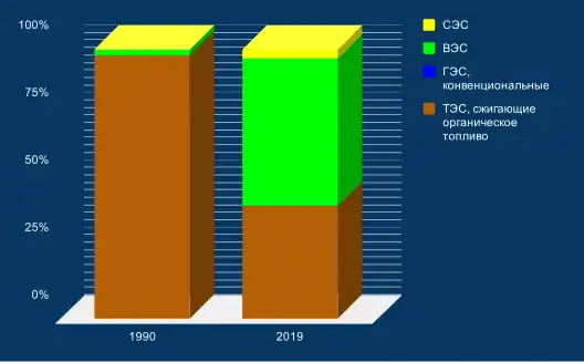 Как и в других странах Европейского союза, в Дании происходят существенные структурные изменения топливного баланса ТЭС в сторону увеличения сжигания природного газа, биотоплива и значительно вовлечения в баланс отходов. Что же касается структуры производства электроэнергии в целом то, если в 1990 г. выработка электроэнергии на ВЭС составляла 610 млн. кВт∙ч, в 2019 г. - 16150 млн. кВт∙ч, то есть рост более 26 раз. Широкое внедрение ВИЭ привело к снижению интегрального показателя эффективности в электроэнергетике - числу часов использования установленной мощности электростанций, что, в свою очередь, является одной из причин резкого увеличения средних цен на электроэнергию, в частности, для бытовых потребителей.