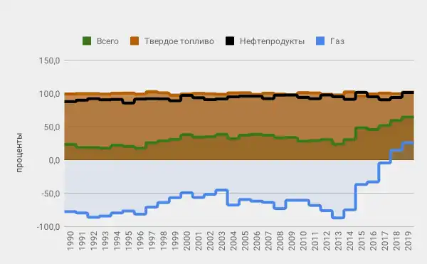 *Примечания: 1. Энергетическая зависимость показывает, в какой степени экономика зависит от импорта для удовлетворения своих энергетических потребностей. Рассчитывается из отношения  импорта-нетто (импорт минус экспорт) на сумму валового внутреннего потребления первичных энергоносителей   и бункерного топлива. 2. Отрицательное значение указывает на чистого экспортера: страну, которая экспортирует больше топлива, чем потребляет.