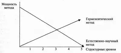 Существует также точка зрения, которую можно воспринимать, как компромисс между двумя выше упомянутыми, — идея об уровнях психической организации[1]. Согласно ей, есть шесть уровней психической регуляции (0 — физиологический уровень, 1 — психофизиологический уровень, 2 — уровень сенсорно-перцептивных процессов, 3 — интегративный уровень психики, 4 — уровень личности, 5 — уровень индивидуальности). Мощность естественно-научного метода имеет самое высокое значение при рассмотрении физиологических процессов и постепенно падает, стремясь к нулю на уровне индивидуальности. Соответственно, мощность герменевтического метода повышается, от нулевого значения на физиологическом уровне, до своего максимального значения на уровне индивидуальности. На диаграмме это отображается следующим образом: