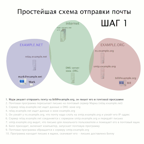 Общепринятым в мире протоколом обмена электронной почтой является SMTP (англ. simple mail transfer protocol — простой протокол передачи почты). В общепринятой реализации он использует DNS для определения правил пересылки почты (хотя в частных системах, вроде Microsoft Exchange, SMTP может действовать, исходя из информации из других источников).