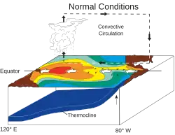Нормальные условия вдоль западного побережья Перу определяются холодным Перуанским течением, несущим воду с юга. Там, где течение поворачивает на запад, вдоль экватора, из глубоких впадин происходит подъём холодных и богатых биогенами вод, что способствует активному развитию планктона и других форм жизни в океане. Само же холодное течение определяет засушливость климата в этой части Перу, формируя пустыни. Пассаты отгоняют прогретый поверхностный слой воды в западную зону тропической части Тихого океана, где формируется так называемый тропический теплый бассейн (ТТБ). В нём вода прогрета до глубин в 100—200 м[3]. Атмосферная циркуляция Уолкера, проявляющаяся в виде пассатов, вкупе с пониженным давлением над районом Индонезии, приводит к тому, что в этом месте уровень Тихого океана на 60 см выше, чем в восточной его части. А температура воды здесь достигает 29—30 °C против 22—24 °C у берегов Перу.