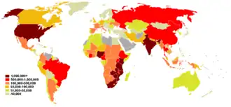 По данным на 2006—2007 годы, в десятку стран с наибольшим количеством ВИЧ-инфицированных людей вошли: Индия (6,5 млн), ЮАР (5,5 млн), Эфиопия (4,1 млн), Нигерия (3,6 млн), Мозамбик (1,8 млн), Кения (1,7 млн), Зимбабве (1,7 млн), США (1,3 млн), Россия (1 млн) и Китай (1 млн)[6].
