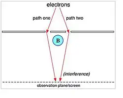 - ↑ R. G. Chambers, "Shift of an Electron Interference Pattern by Enclosed Magnetic Flux, " Phys. Rev. Lett. 5, 3 (1960); G. Möllenstedt and W. Bayh, Physikalische Blätter 18, 299 (1961)