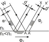 На рисунке приведена схема сдвига Гуса — Хенхен. W — ограниченная плоская волна. Ф1, Ф2 и Ф3 — три потока энергии, равенство которых вытекает из закона сохранения энергии. Из этого равенства Ренар[5] вывел, что величина сдвига Гуса — Хенхен определяется зависимостями: