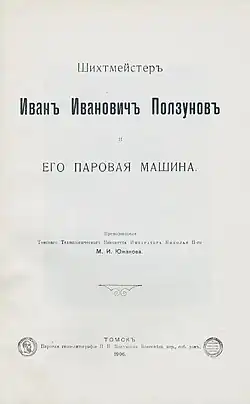 - Шихтмейстер И. И. Ползунов и его паровая машина // Известия Томского технологического института Императора Николая II — Т. 4, 1907, No. - Томск, 1907.