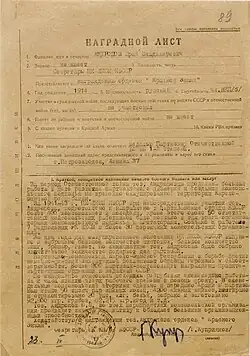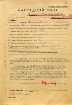 - ↑ по представлению первого секретаря ЦК партии КФССР Куприянова, за умелое руководство комсомолом в военные годы.