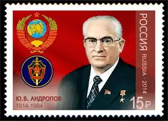 Ю́рий Влади́мирович Андро́пов (2 [15] июня 1914[3][4], станция[5] Нагутская[1], Ставропольская губерния, Российская империя — 9 февраля 1984, Москва, РСФСР, СССР) — советский политический, государственный и партийный деятель, руководитель СССР в 1982—1984 годах. Генеральный секретарь ЦК КПСС (1982—1984), председатель Президиума Верховного Совета СССР (1983—1984). Председатель Комитета государственной безопасности СССР (1967—1982). Секретарь ЦК КПСС по идеологии в 1982 году и секретарь ЦК КПСС (1962—1967), член Политбюро ЦК КПСС с 1973 года (кандидат с 1967 года). Депутат Верховного Совета СССР 3-го и 6—10-го созывов. Герой Социалистического Труда (1974), кавалер четырёх орденов Ленина (1957, 1964, 1971, 1974).