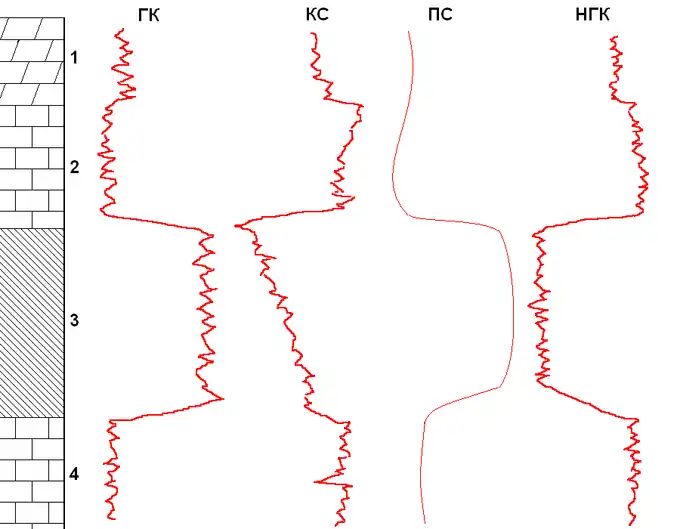 - Литологическое расчленение разреза на пласты. Интенсивность гамма-излучения отличается у разных пластов пород, так как в них содержится разное количество радиоактивных элементов. Наибольшие показания у породы, содержащей калий-40, радий и другие радиоактивные элементы; отдельно следует упомянуть граниты и глины, содержащие большое их количество. Минимальные значения наблюдаются у карбонатов и чистых песчаников, углей, пород гидрохимического происхождения, хемогенных осадков (ангидритов, гипсов, галита).