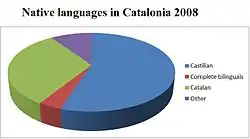 В автономной сообществе Каталония, входящей в состав королевства Испания, официальный статус имеют три романских по происхождению языка: каталанский язык (повсеместно), испанский язык (повсеместно) и аранский язык (только в области Аранская долина на северо-западе провинции). К ним следует добавить четвёртый язык — каталонский язык жестов (также имеющий официальный статус). Население Каталонии говорит также и на многих других языках, которые появились здесь в результате недавних волн иммиграции со всех континентов мира. В начале XXI века в регионе по-прежнему широко распространено каталано-испанское двуязычие, однако с конца XIX века в Каталонии здесь также происходит фактическая поляризация населения по обиходному языку: автохтоны всё больше самоидентифицируют себя только с каталонским языком, в то время как в среде иммигрантов из других регионов Испании продолжает сохраняться употребление испанского[1]. Позитивная дискриминация в школах в пользу каталонского языка, получившая распространение в автономии после 1979 года (испанский сохранён в школах фактически только как иностранный язык), также способствует постепенной каталанизации молодёжи.