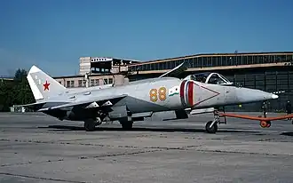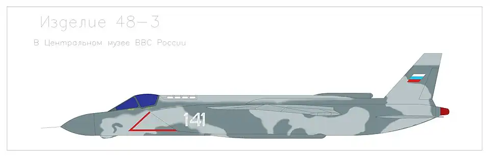 Як-141 (внутреннее обозначение: изделие 48/48М) — многоцелевой сверхзвуковой всепогодный[9] палубный истребитель вертикального/короткого взлёта и посадки разработки ОКБ Яковлева. Стал третьим в мире СВВП (после EWR VJ 101 и Dassault Mirage IIIV), преодолевшим скорость звука. Як-141 предназначался для обеспечения прикрытия авианосных соединений от авиации противника, завоевания и удержания господства в воздухе, ведения ближнего манёвренного и дальнего боя, а также для нанесения ударов по наземным и надводным целям[10].