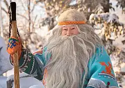 Всегда берёт с собой волшебный деревянный посох, украшенный изысканным орнаментом. Ещё одним сказочным атрибутом Дедушки Севера является волшебный бубен, который помогает избавиться от плохих мыслей, делает добрых людей сильнее, а злых — добрее[2][3].