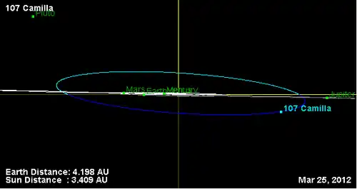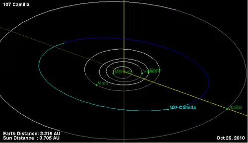 - ↑ AstDys (107) Camilla Ephemerides. Department of Mathematics, University of Pisa, Italy. Дата обращения: 28 июня 2010. Архивировано из оригинала 29 июня 2011 года.