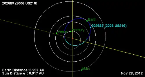 - Орбита астероида 2006 US216 и его положение в Солнечной системе