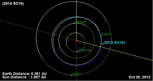 (419624) 2010 SO16 — маленький околоземный астероид из группы аполлона, обладающий крайне интересной орбитой: очень близкой к орбите Земли, но не допускающей приближений астероида к нашей планете менее, чем на 0,15 а.е. Астероид был открыт 17 сентября 2010 года с помощью инфракрасного космического телескопа WISE, данные с которого были проанализированы в обсерватории Армы, близ одноимённого города в Ирландии[2]. Абсолютная звёздная величина этого астероида составляла всего 20,7m. Таким образом, для его наблюдения требуются очень крупные телескопы. При неизвестном альбедо поверхности, это позволяет оценить размер астероида в 200–400 метров.