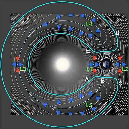 Далее под действием гравитационного поля нашей планеты (419624) 2010 SO16 сближается с Землёй на минимальное расстояние (точка B) и оказывается между ней и точкой Лагранжа L5, после чего он переходит на внешнюю орбиту (точка C). Теперь, находясь на внешней орбите относительно Земли и двигаясь с меньшей скоростью он начинает отставать от нашей планеты и совершает обороты вокруг Солнца с периодом, несколько превышающим один год, чтобы в конечном итоге оказаться по другую сторону нашей планеты (точка D). Здесь он снова сближается с Землёй, совершая гравитационный манёвр между ней и точкой Лагранжа L4, после чего снова оказывается на внутренней орбите (точка E) и начинает движение в обратную сторону, вновь нагоняя её.