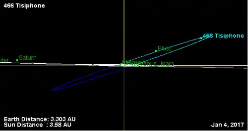 - ↑ AstDys (466) Tisiphone Ephemerides. Department of Mathematics, University of Pisa, Italy. Дата обращения: 2 января 2013. Архивировано из оригинала 12 января 2013 года.