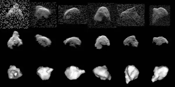 Средний ряд: ожидаемое радиолокационное эхо рассчитанное по модели, для сравнения с реальными радиолокационными изображениями.