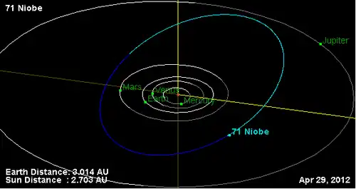 - ↑ Warner, Brian D.; et al. (2006), Analysis of the lightcurve of 71 Niobe, Bulletin of the Minor Planets Section of the Association of Lunar and Planetary Observers, 33 (4): 102–103, Bibcode:2006MPBu...33..102W