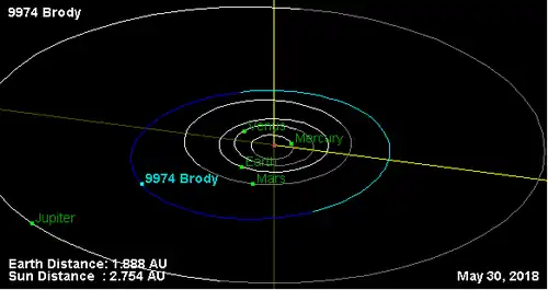 ![]() Орбита астероида (9974) Броуди (синим), орбиты планет (красным) и Солнце в центре (чёрным). | |