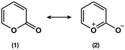 Шестичленные гетероциклические молекулы, которые содержат единственный гетероатом в виде кислорода, известны как пироны. Долгое время вопрос о степени ароматичности данной молекулы был предметом многих обсуждений и споров. Степень ароматичности связана с вкладом диполярной структуры (2) (в ней имеется «полный» ароматический цикл) в структуру пиронов. Однако, при использовании ПМР-спектра было обнаружено, что в молекуле отсутствует кольцевой ток, вследствие этого напрашивается вывод, что ароматические свойства молекулы незначительны. Кроме того, в ИК-спектре присутствует полоса поглощения карбонильной группы, что свидетельствует в пользу структуры ненасыщенного лактона.