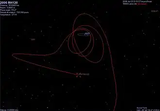 2006 RH120 — маленький околоземный астероид[1] диаметром около 2—3 метров[4], который обычно обращается вокруг Солнца, но приближается к системе Земля — Луна примерно каждые 20 лет[5]. Время от времени объект переходит на геоцентрическую орбиту. В период такого временного захвата спутника этот метеороид становится единственным известным естественным спутником Земли помимо Луны. В то же время Алан Харрис из Space Science Institute отмечает, что «называть кусок мусора на временной циклической орбите „спутником“, учитывая всю смысловую нагрузку данного термина, — это всего лишь преувеличение»[5][6].