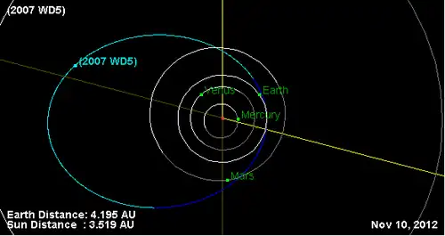 - Орбита астероида 2007 WD5 и его положение в Солнечной системе