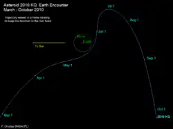 - ↑ 2010 KQ — a very small, very close asteroid. Дата обращения: 22 марта 2012. Архивировано 5 августа 2012 года.