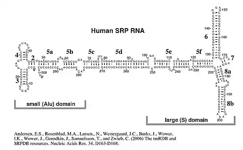 Длина 7SL РНК около 300 нуклеотидов, выделенная из SRP молекула РНК имеет коэффициент седиментации 7S[8]. Во вторичной структуре 7SL РНК есть восемь спиральных элементов, которые складываются в Alu-домен и S-домен, разделенные длинной линкерной областью[9]. Считается, что Alu-домен опосредует функцию замедления элонгации пептидной цепи[9]. Спираль 8, которая взаимодействует с M-доменом белка SRP54, опосредует распознавание сигнальной последовательности. Последовательность спирали 8 обладает высоким сходством с гомологичными РНК бактерий и архей. Считается, что комплекс «SRP19 — спираль 6» участвует в сборке SRP и стабилизирует спираль 8 для связывания с SRP54[10].