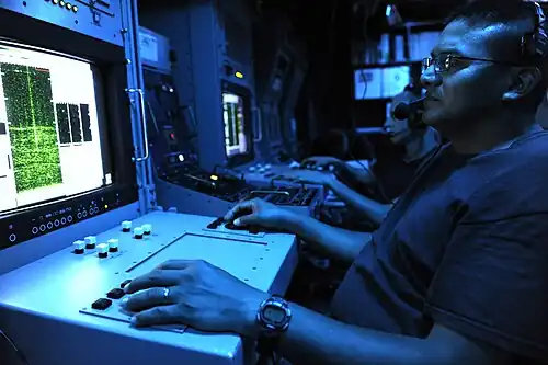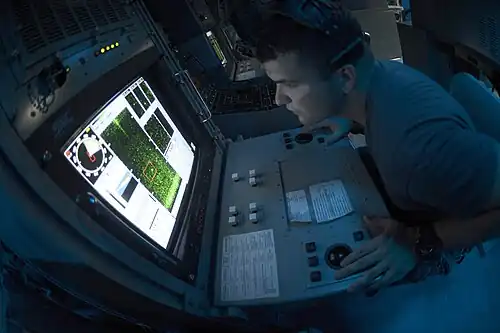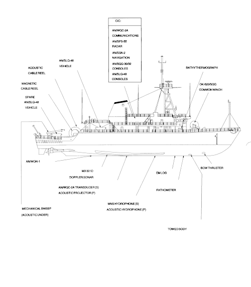 В корпусе днища кораблей типа «Авенджер» смонтирован автоматический навигационный доплеровский гидролокатор-измеритель глубины WQN-1, работающий в сочетании с SQQ-32[1] |