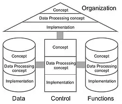 Методология, использующаяся в ARIS, предполагает рассмотрение организации с пяти точек зрения: организационной, функциональной, обрабатываемых данных, структуры бизнес-процессов, продуктов и услуг. При этом каждая из этих точек зрения разделяется ещё на три подуровня: описание требований, описание спецификации, описание внедрения. Для описания бизнес-процессов предлагается использовать около 80 типов моделей, каждая из которых принадлежит тому или иному аспекту. ARIS предоставляет визуальный инструментарий для обеспечения наглядности моделей. Также инструментарий поставляется с набором референтных моделей, заранее разработанных для типичных процессов в различных отраслях. Общий принцип в инструментарии — возможность интеграции моделей разных типов в рамках одного репозитория посредством декомпозиции (детализации) объектов. Таким образом, любую организацию можно описать с помощью иерархии моделей — от обобщения: например, процессы верхнего уровня с помощью модели VACD (англ. value added chain diagram) до уровня процедур и ресурсного окружения функций.