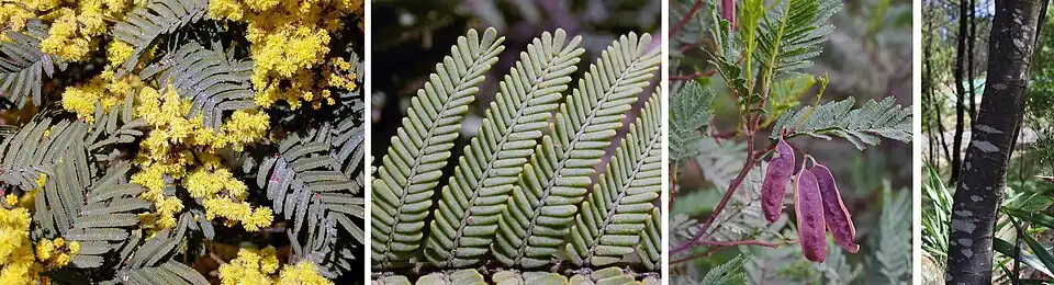 - Цветки, листья, плоды и ствол Acacia nanodealbata